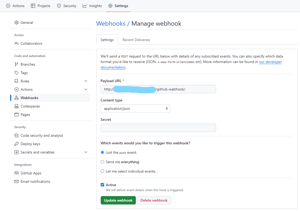 Payload URL에 본인의 도메인과 이용중인 젠킨스 포트번호를 등록한다.