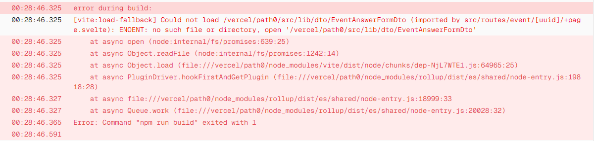 그리고 vercel에서 git저장소의 Svelte프로젝트와 연동하여 자동으로 빌드 및 배포가 진행되는데 아래와 같은 문제가 발생했다.
